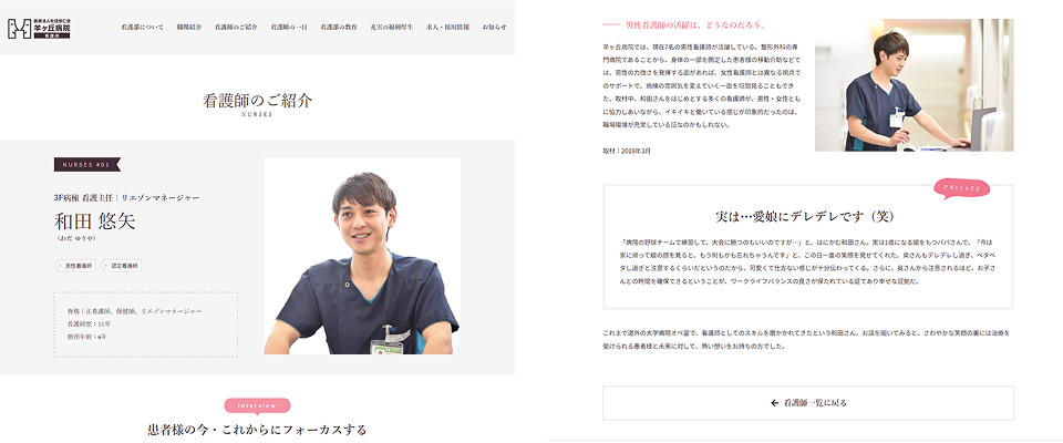 こちらは、本人にインタビューした内容を取材者目線で作られたページです。病院という業種なので砕けすぎないよう作られており、その中でもギャップある内容も含まれていて求職者との距離も近づきやすい記事になっています。