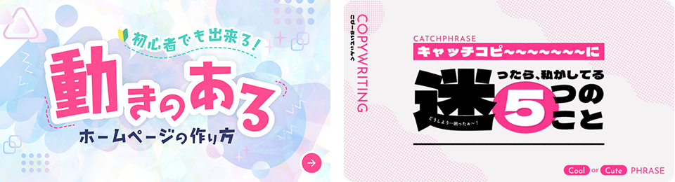 まずは左側の「動きのある」のデザインですが、タイトル通り動きがあるようなデザインにしてその雰囲気を出しました。初心者でも出来る!といサブタイトルがあり、優しさも表現したかったので色味や丸みのあるほわほわした装飾にしています。