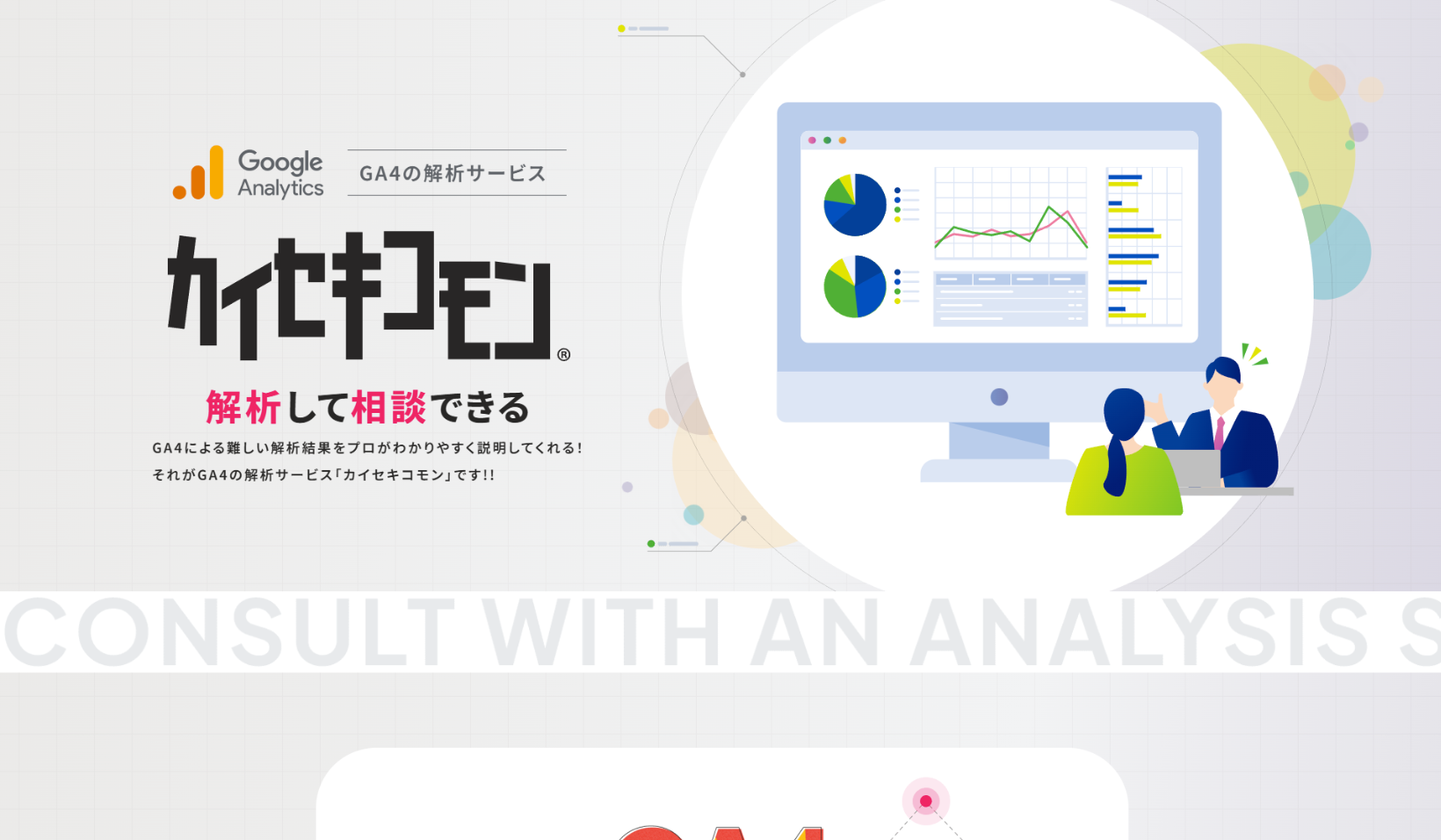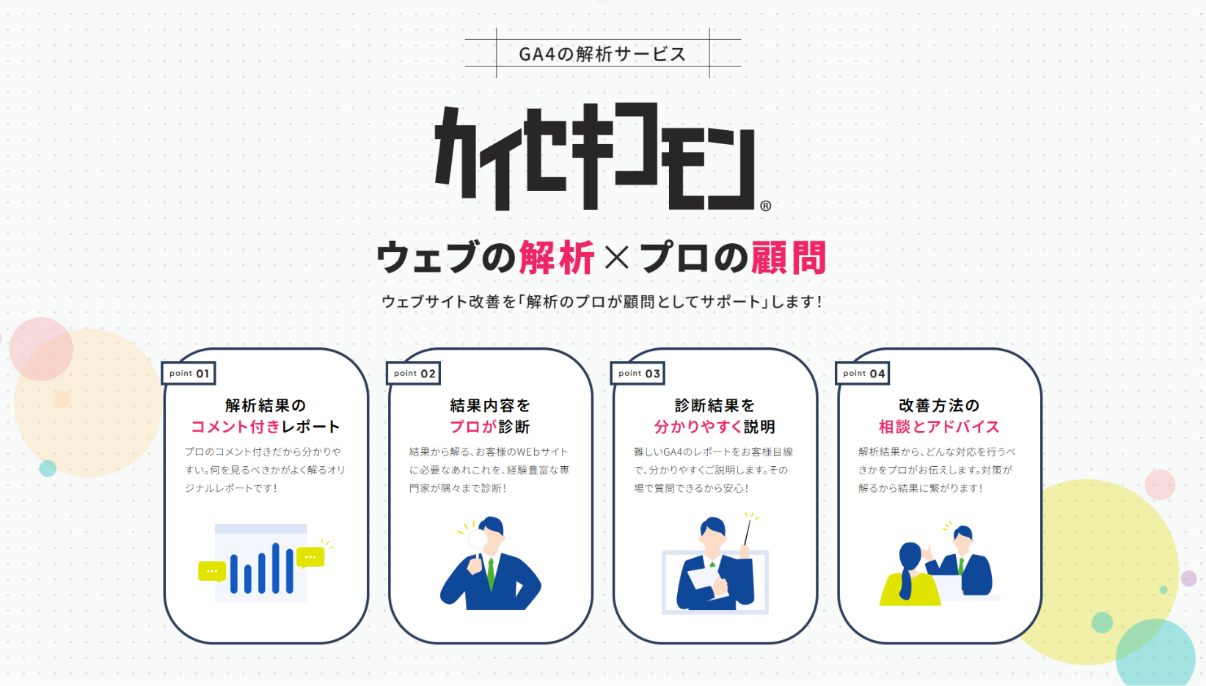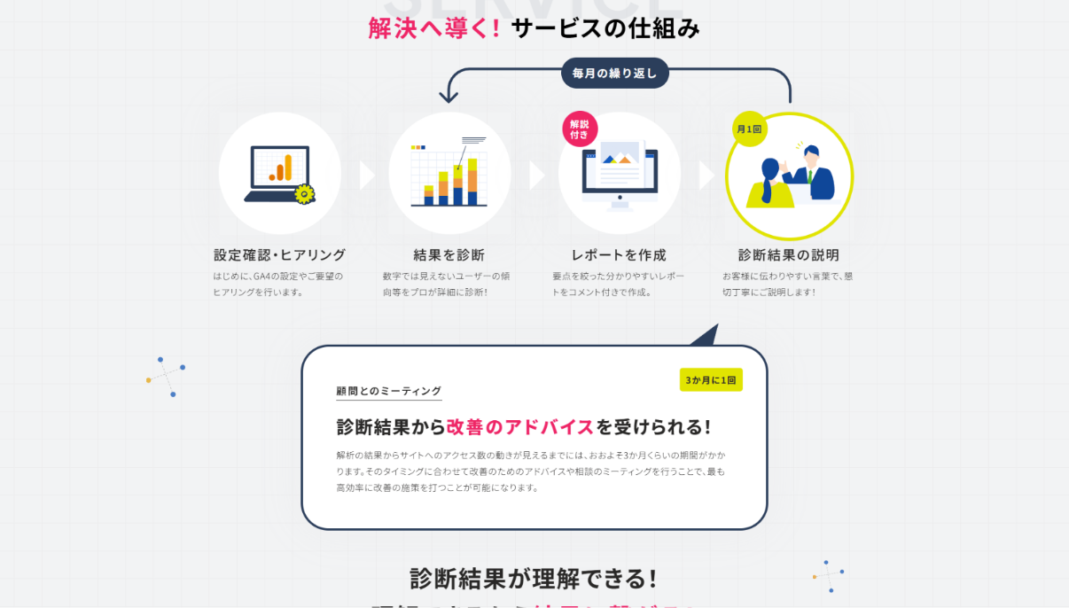 お客様とのお話し合いの末、「ウェブサイトで集客をしたい」「売上を伸ばしたい」といったユーザーのニーズに対して、その成果を出すためには“正しい解析”が欠かせないという点を、もっと明確に訴求する必要があることに辿り着きました。 そこで、現在の構成を見直し、「なぜ解析が必要なのか」「解析によってどのような成果につながるのか」といったストーリー性を持たせたコンテンツへと再構築する案をご提案させていただきました。 ご提案内容にご理解いただきそこから、テーマに沿ったデザインを制作し、公開するに至りました。