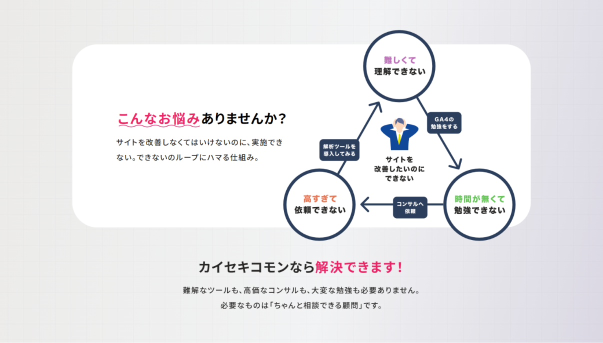 このWEBサイトのサービス「カイセキコモン」の拡販を見据えた際、元のランディングページでは、本サービスの本質的な価値が十分に伝わっていない可能性があると感じているとのことでした。